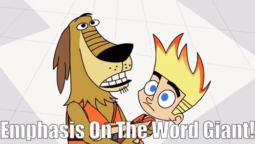 Johnny Test and Dukey from the cartoon series react to something, with the caption 'Emphasis On The Word Giant!'.