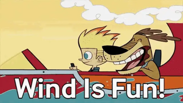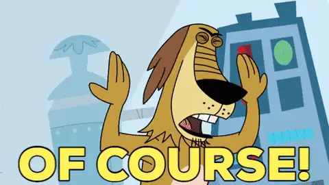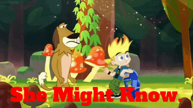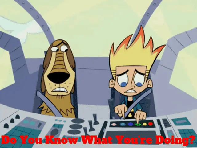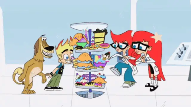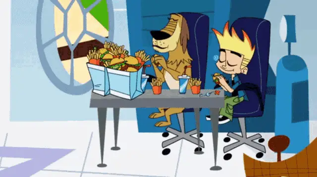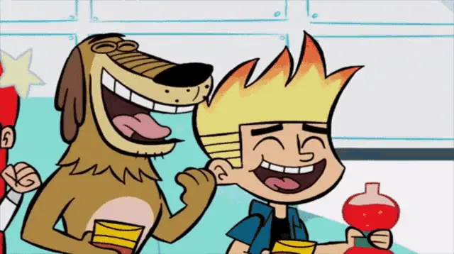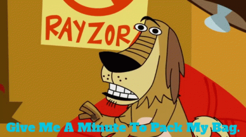 Johnny Test's dog, Dukey, demands a minute to pack his bag, sitting in front of a 'RAYZORZ' sign.