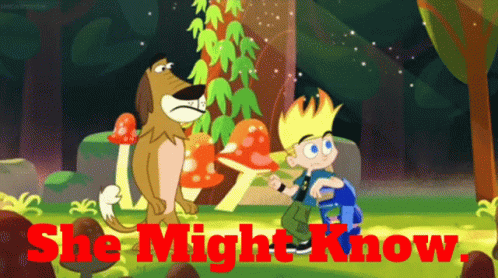 Johnny Test and his dog Dukey in a cartoon scene with the on-screen text 'She Might Know'.