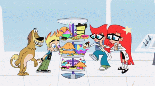 Johnny Test, Dukey, Susan, and Mary indulge in a massive junk food feast from a multi-tiered dessert stand.