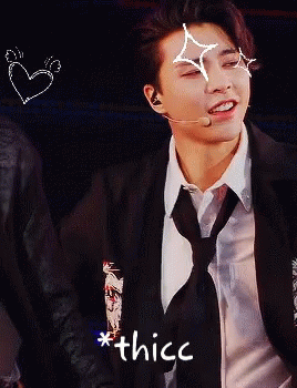 Johnny from NCT 127 performs on stage, with a 'thicc' text overlay and playful expressions.