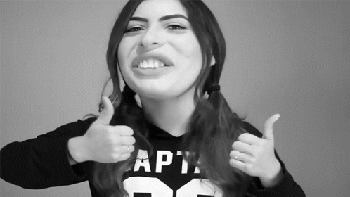 Kim Rosa Cuca gives a double thumbs up with a big smile, wearing a dark hoodie.