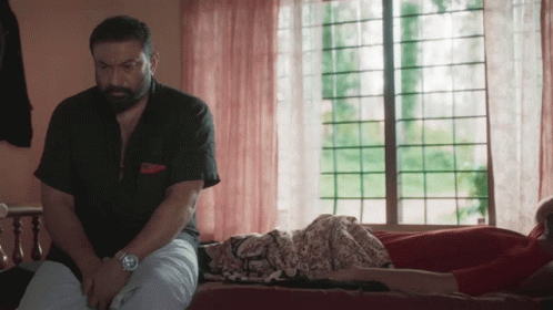 Fahadh Faasil as Joji sits beside a woman, uttering the iconic line 'Society oru myrana' from the Malayalam movie Joji, also featuring Baburaj.