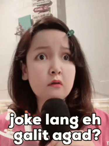 Lilet Esteban reacts with a surprised expression to the phrase 'Joke lang eh galit agad?' while holding a microphone.