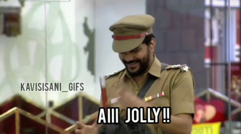 Kavin, dressed in a police uniform, smiles broadly and exclaims 'Aiii Jolly!!' in a happy moment.