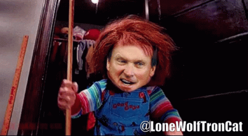 Jon Gruden's face superimposed onto a Chucky doll, holding a ruler and emerging from a dark space.