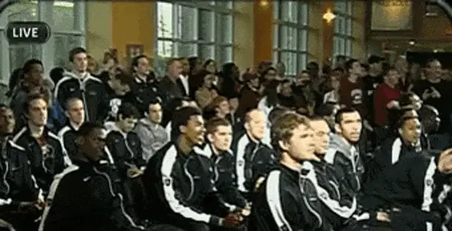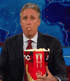 Jon Stewart in a suit and tie, holding a large bucket of popcorn and reacting while eating.