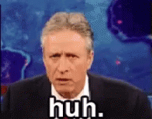 Jon Stewart, in a suit and red tie, expresses confusion with his iconic 'huh' reaction.