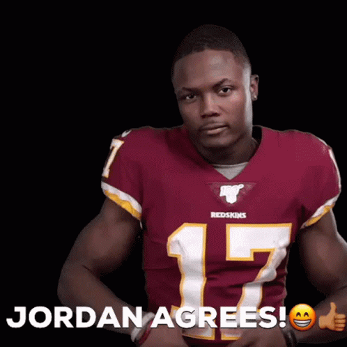 Jordan Nte gives a double thumbs up while wearing a Redskins jersey, showing his agreement.