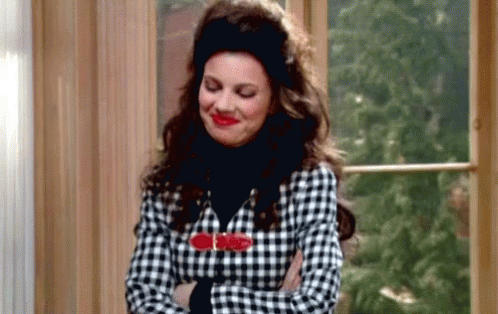 Fran Drescher in a stylish black and white gingham jacket, arms crossed, with her signature big hair and red lipstick.