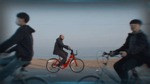 Jordi Baste waves while riding a red Bicing bike along a coastal road in Barcelona.