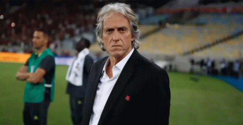 Jorge Jesus, the football manager, stands on a soccer field looking at the camera.