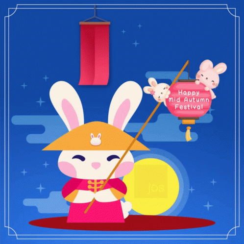 Cute rabbit illustration celebrating Jos Mid-Autumn Festival with lanterns and traditional Chinese characters.