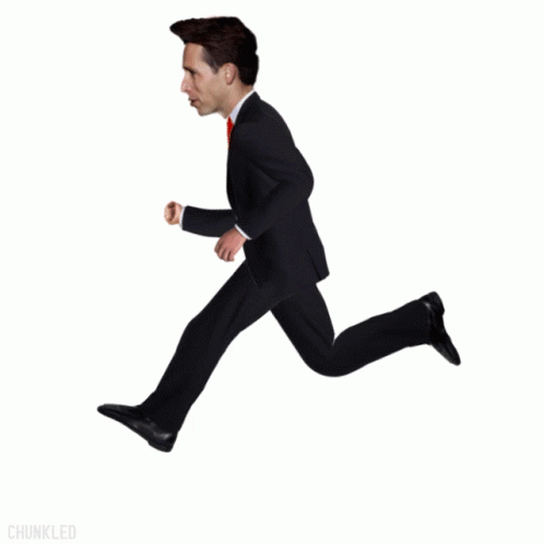Josh Hawley, dressed in a suit, is depicted running across a white background in a meme-like fashion.
