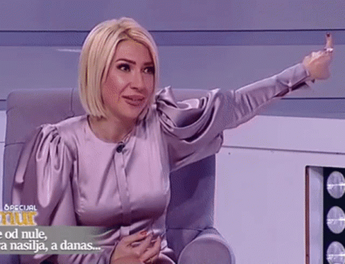 Jovana Jeremic, a Serbian TV personality, sits in a studio, speaking and gesturing with her hand.