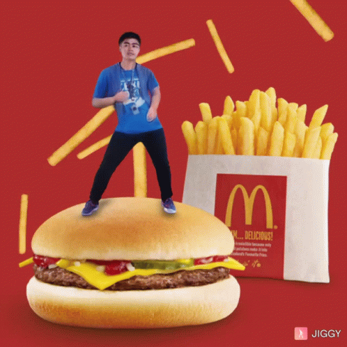Jovic Bek Bek dances energetically on a giant McDonald's cheeseburger, with fries falling in the background.