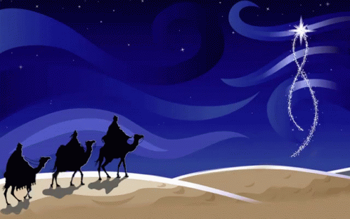 Three wise men on camels follow the Christmas star in a desert, symbolizing the journey to Bethlehem.