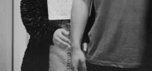 A woman gently caresses a man's arm in a black and white, intimate moment.