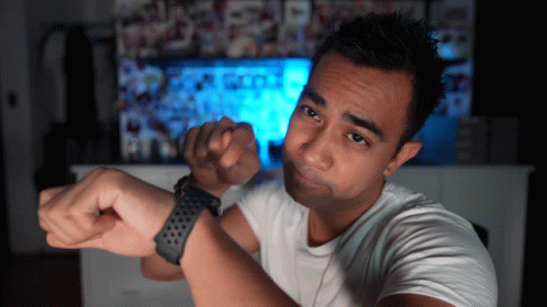Jpa Late checks his smartwatch, making a face as if he's late or questioning the time.
