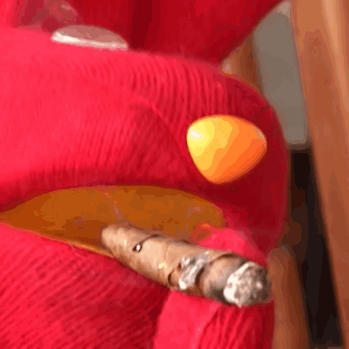 Juan Carlos Bodoque, the red puppet, is seen smoking a lit cigar, with smoke rising from it.