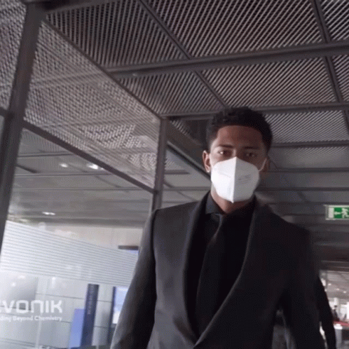 Jude Bellingham walks confidently in a black suit and white face mask.