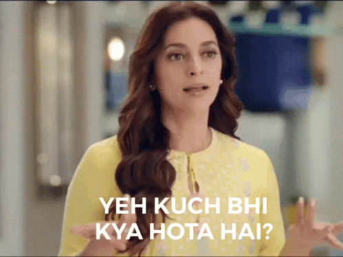 Juhi Chawla, in a yellow dress, expresses confusion by asking 'Yeh Kuch Bhi Kya Hota Hai?'.