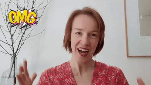 Julia Goessler reacts with an exaggerated 'OMG' expression, hands raised in surprise or excitement.