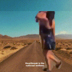 Julie Welt and another woman in a dramatic scene on a desert road with "Heartbreak is the national anthem" text.