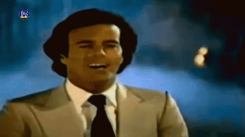 Julio Iglesias performs in a classic suit and tie, delivering a heartfelt vocal performance against a dark background.