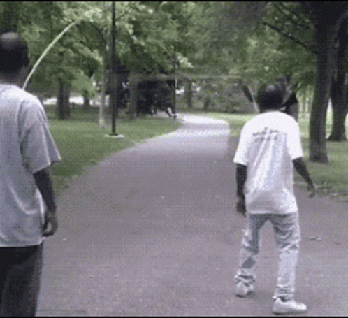 A man attempts to jump rope in a park, trips over the rope, and falls to the ground in a funny fail.