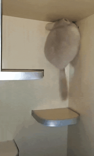 A fluffy chinchilla hangs upside down from a shelf, attempting to reach a lower level in a corner.