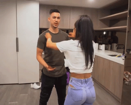 Tia playfully jumps into Jamie Zhu's arms in a kitchen, sharing a tight embrace.