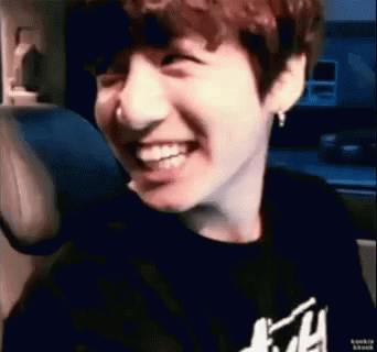 Jungkook from BTS smiles adorably, wearing a black shirt, showcasing his 'Bunny' and 'Too Cute' persona.