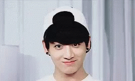 Jungkook making a funny duck face while wearing a white cap and black earrings.