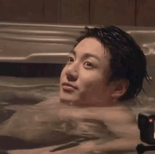 Jungkook relaxing in a hot tub, looking around and closing his eyes, enjoying a moment of peace.