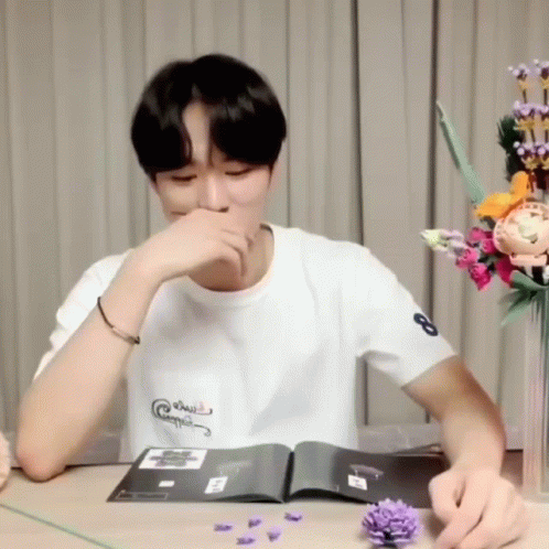 Junseo Wei from 1THE9 building Lego flowers, looking at instructions and smiling.