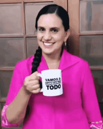 Veronika Mendoza, from Juntos Por El Peru, smiles while holding a mug that says 'Vamos a Cambiarlo Todo'.