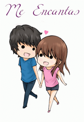 A cute cartoon couple, a boy and a girl, holding hands with the Spanish phrase "Me Encantas" (I love you) above them.