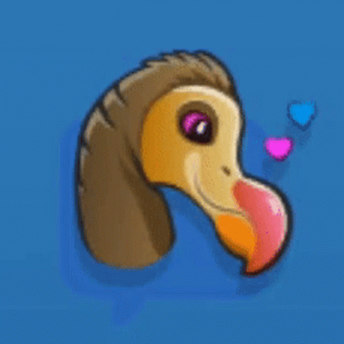 A Dodo bird emote from Jurassic World Alive, showing affection with hearts floating around its head.