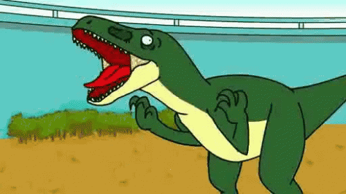 Animated Velociraptors in a Jurassic World setting, one comically sprinkles salt on a man.