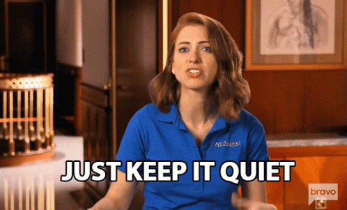 A woman in a blue uniform shirt emphatically says "Just Keep It Quiet" with wide eyes and hand gestures.