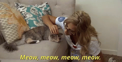 A woman from The Bachelor lovingly pets a cat on a couch, repeating 'Meow, meow, meow, meow'.