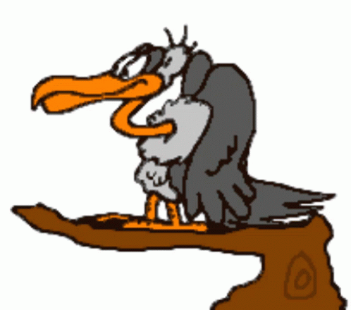 A cartoon vulture sits patiently on a tree branch, embodying the phrase 'Just Sitting Here Waiting4you'.