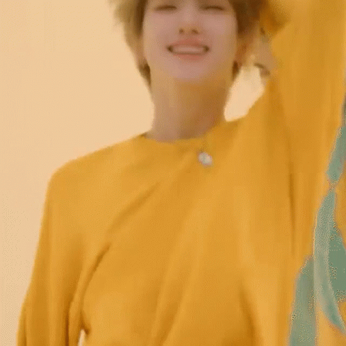 JUSTB's Doyum smiles brightly while wearing a yellow sweatshirt, looking happy.