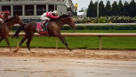 Justify races towards victory in the Triple Crown, ridden by a jockey at a Kentucky race.