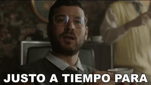 A man with glasses holds a teacup, stating 'Justo a tiempo para acompañar el té' (Just in time for tea).
