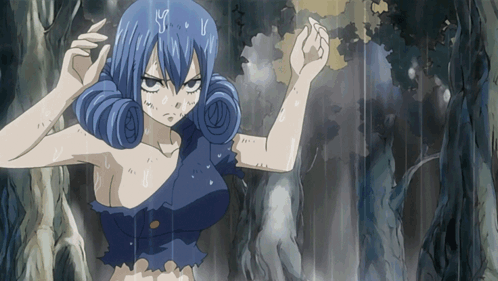 Juvia Lockser from Fairy Tail unleashes powerful water magic, creating large waves in a dynamic scene.