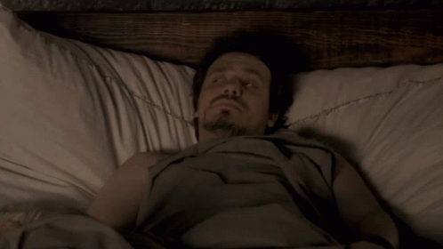 Arthur from Kaamelott struggles to wake up in bed, looking disoriented.
