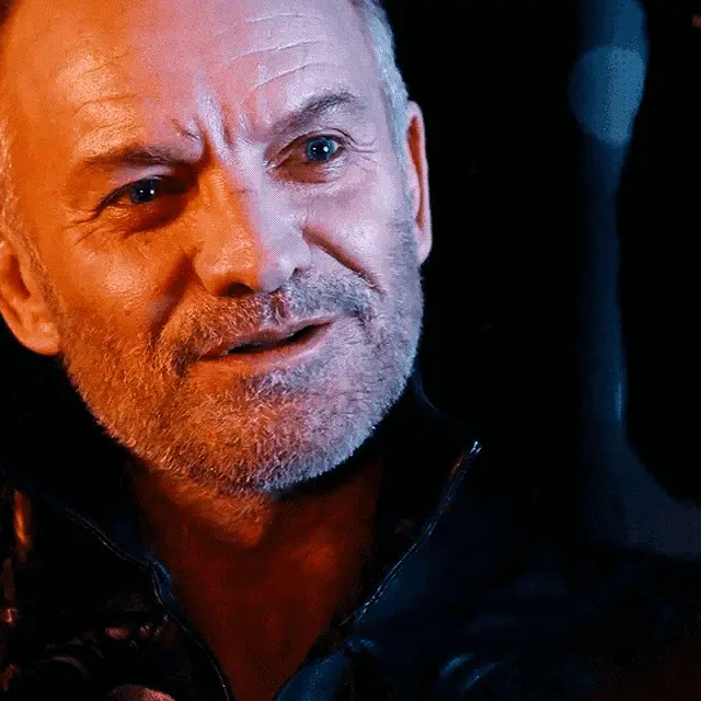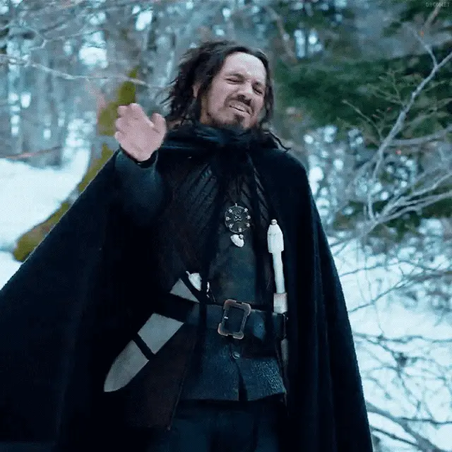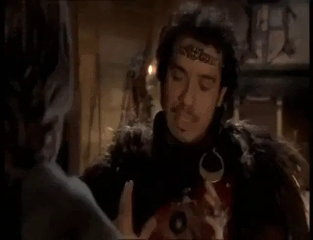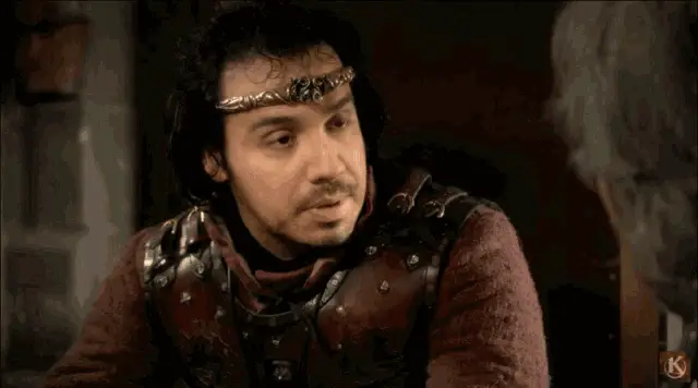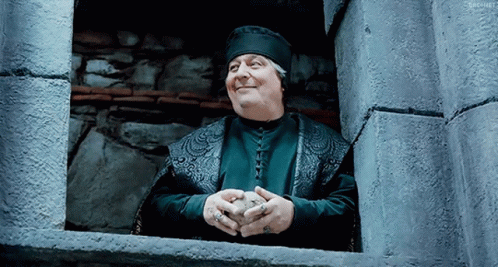 Christian Clavier as Le Jurisconsulte from Kaamelott smiles from a stone window, holding a small object.