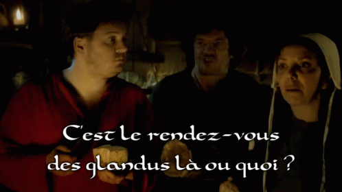 Leodagan and two others in a dark room, asking 'Is this the meeting of the idiots or what?' from Kaamelott.